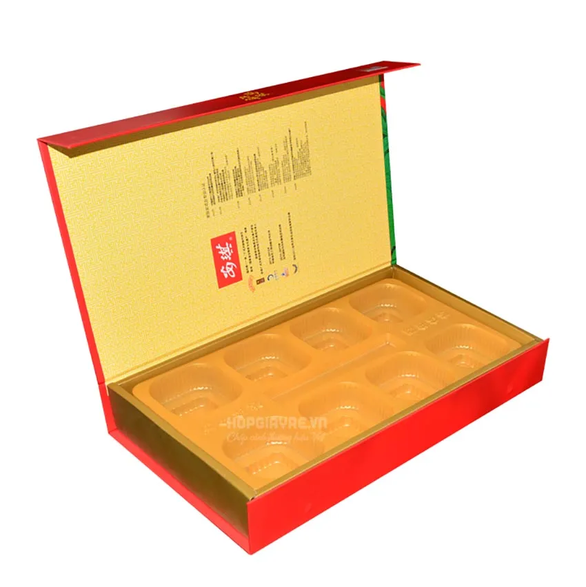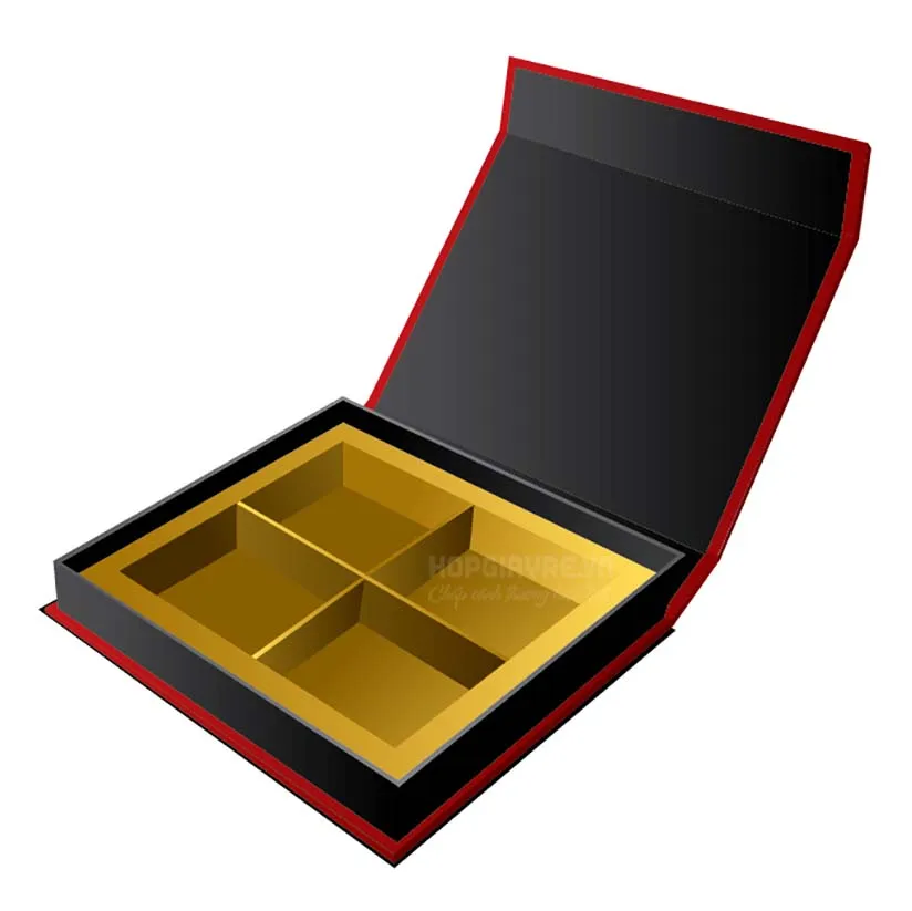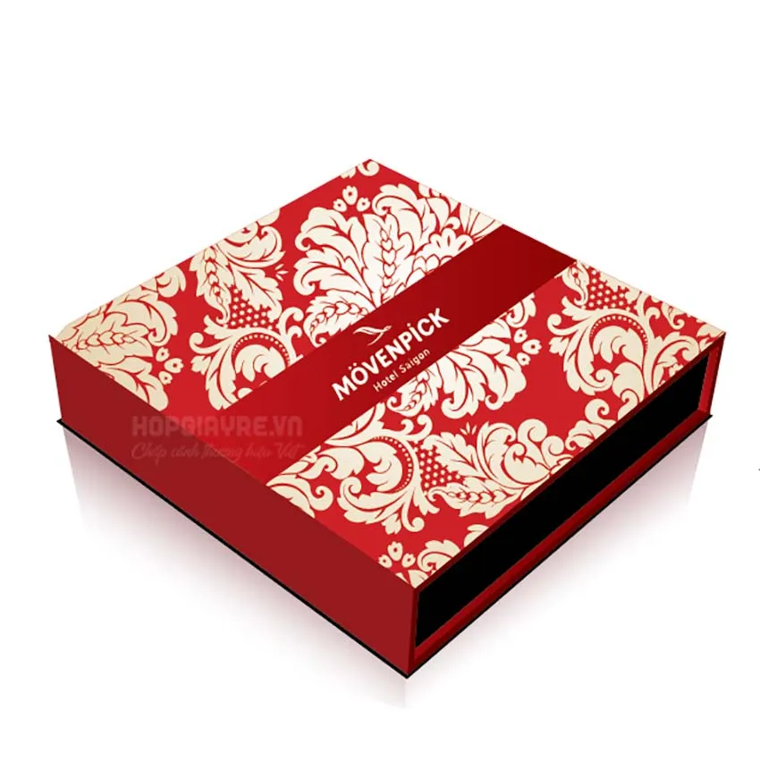 Chi tiết sản phẩm: Hộp bánh trung thu cao cấp nam châm - HCTT 0007 Kích thước tham khảo: 25x25x7cm Chất liệu sản phẩm: giấy Carton lạnh bồi giấy Couches. Chất liệu giấy cao cấp, sang trọng, cứng cáp, giúp bảo vệ sản phẩm an toàn tuyệt đối, cho dù có lực tác động từ bên ngoài. Gia công: cán mờ mặt ngoài, chống trầy xước và giúp sản phẩm sang trọng hơn. Có thể ép kim để làm nổi bật logo sản phẩm. Màu sắc: nền màu đỏ đô sang trọng, màu hoa văn sáng nổi bật. Thiết kế: lôi cuốn, hiện đại, hoa văn biểu trưng, ý nghĩa. Quy cách hộp: là 1 dạng hộp cứng nắp mở 2 nam châm. Hộp bánh trung thu cao cấp nam châm Nội dung cần thiết trên Hộp bánh trung thu cao cấp nam châm: Hình ảnh ý nghĩa Câu chúc Tên thương hiệu hoặc chữ ký Hopgiayre.vn chuyên cung cấp sản phẩm in hiện đại, tiên tiến nhất, mang lại những giá trị sản phẩm tốt nhất cho khách hàng. Để đặt hàng và được tư vấn thiết kế miễn phí, xin vui lòng liên hệ với chúng tôi qua: Hotline:0985 36 36 79 - Email: baogia@hopgiayre.vn
