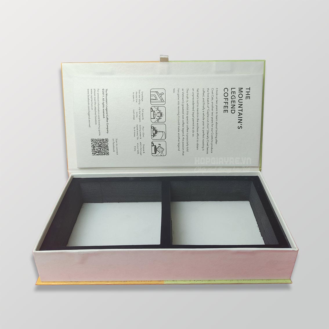 Chi tiết sản phẩm: Hộp cà phê cao cấp - HCCF 0001 Kích thước tham khảo: 25x12x5cm Chất liệu sản phẩm: giấy Carton lạnh bồi giấy Couches. Chất liệu giấy cao cấp, dẻo dai, cứng cáp, giúp bảo vệ sản phẩm bên trong tốt nhất. Bên trong vỏ hộp có khay mềm có khả năng chống sốc, chống vỡ. Dù cho có lực tác động từ bên ngoài. Gia công: cán mờ mặt ngoài, chống trầy xước và giúp sản phẩm sang trọng hơn. Ép kim logo, tên thương hiệu sản phẩm để làm nổi bật. Màu sắc: tông màu sáng, màu vàng nổi bật. Thiết kế: hiện đại, hình ảnh làm nền cho sản phẩm, tên sản phẩm nổi bật. Quy cách hộp: là dạng hộp cứng âm dương nắp mở 2 nam châm. Hộp cà phê cao cấp Nội dung cần thiết trên Hộp cà phê cao cấp: Logo thương hiệu, tên thương hiệu Slogan. Series, barcode sản phẩm. Hopgiayre.vn chuyên cung cấp sản phẩm in hiện đại, tiên tiến nhất, mang lại những giá trị sản phẩm tốt nhất cho khách hàng. Để đặt hàng và được tư vấn thiết kế miễn phí, xin vui lòng liên hệ với chúng tôi qua: Hotline:0985 36 36 79 - Email: baogia@hopgiayre.vn