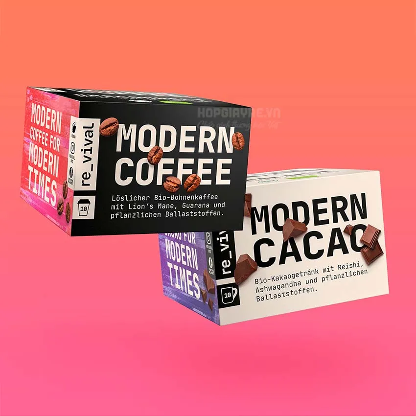 Chi tiết sản phẩm: Hộp giấy đựng cà phê hiện đại - HGCF 0002 Kích thước tham khảo: 8x11x8cm Chất liệu sản phẩm: giấy Ivory 350. Chất liệu giấy cao cấp, rất dai và bền, loại giấy in bền màu và rất đẹp, giấy dày bảo vệ sản phẩm rất tốt. Gia công: cán bóng mặt ngoài, chống trầy xước và giúp sản phẩm sang trọng hơn. Màu sắc: tông màu mạnh. phá cách, chủ yếu làm nổi bật sản phẩm. Thiết kế: mang phong cách hiện đại, background theo xu hướng, nhấn mạnh thương hiệu và sản phẩm. Quy cách hộp: là dạng hộp 1 nắp mở 1 đáy gài, gọn gàng, tiện lợi, mang đi dễ dàng. Hộp giấy đựng cà phê hiện đại Những thông tin cần thiết trên Hộp giấy đựng cà phê hiện đại: Ngày sản xuất, hạn sử dụng. Thông tin, địa chỉ liên lạc của nhà phân phối, hotline hỗ trợ chăm sóc khách hàng. Đặc tính, nguyên liệu của sản phẩm. Hopgiayre.vn chuyên cung cấp sản phẩm in hiện đại, tiên tiến nhất, mang lại những giá trị sản phẩm tốt nhất cho khách hàng. Để đặt hàng và được tư vấn thiết kế miễn phí, xin vui lòng liên hệ với chúng tôi qua: Hotline:0985 36 36 79 - Email: baogia@hopgiayre.vn