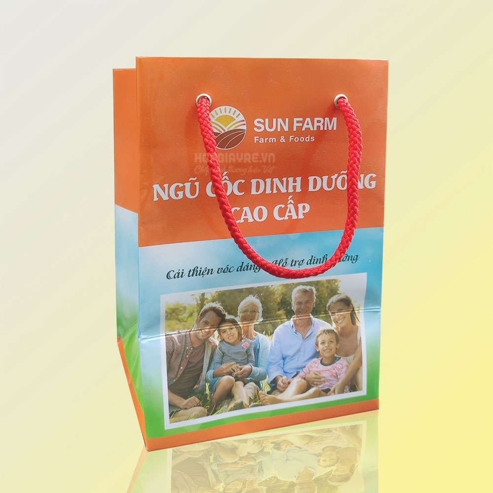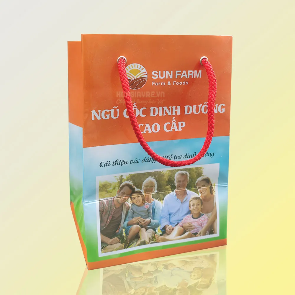 Chi tiết sản phẩm: Túi giấy đựng thực phẩm ngũ cốc dinh dưỡng - TGTP 0001 Kích thước tham khảo: 22x15x10cm Chất liệu sản phẩm: giấy Couches 300. Chất liệu giấy dày, cao cấp, giúp chịu được tốt sức nặng của sản phẩm. Gia công: cán bóng mặt ngoài, tạo sự bóng bẩy cho túi và chống trầy xước túi. Màu sắc: màu cam đất, màu thực phẩm, màu chung của các loại hạt. Thiết kế: đơn giản, mộc mạc, chủ yếu làm cho hình ảnh nổi bật, hấp dẫn. Quy cách túi: là kiểu túi xỏ dây phổ biến. Túi giấy đựng thực phẩm ngũ cốc dinh dưỡng Nội dung cần thiết trên Túi giấy đựng thực phẩm ngũ cốc dinh dưỡng: Tên thương hiệu, tên sản phẩm Logo thương hiệu, hoặc chữ ký. Hopgiayre.vn chuyên cung cấp sản phẩm in hiện đại, tiên tiến nhất, mang lại những giá trị sản phẩm tốt nhất cho khách hàng. Để đặt hàng và được tư vấn thiết kế miễn phí, xin vui lòng liên hệ với chúng tôi qua: Hotline:0985 36 36 79 - Email: baogia@hopgiayre.vn
