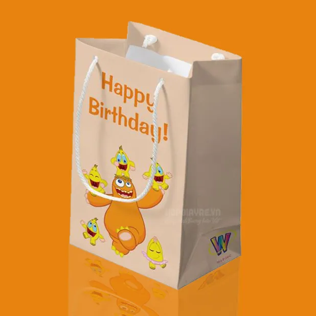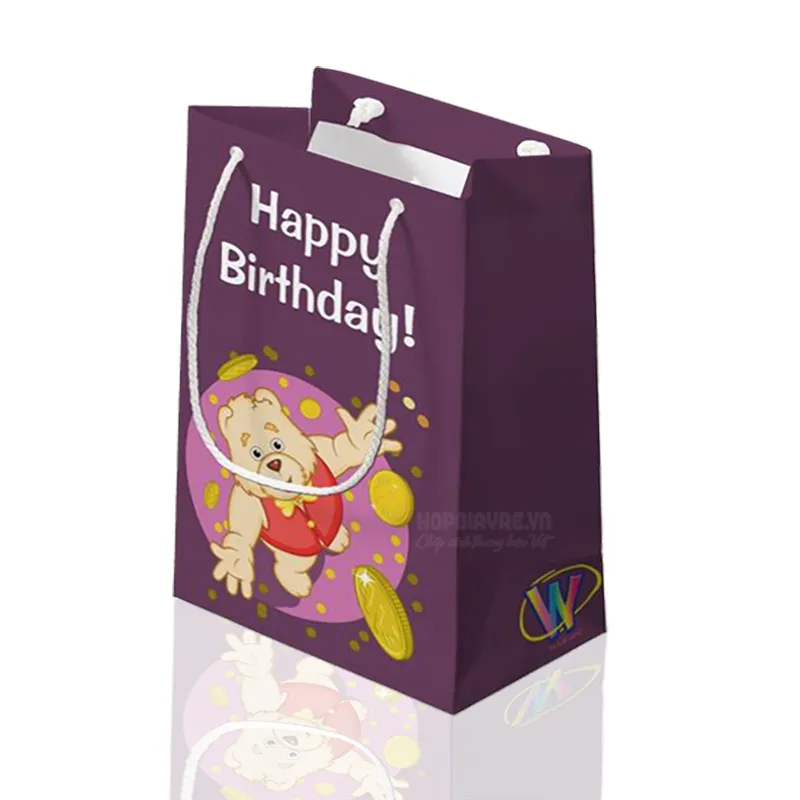 Chi tiết sản phẩm: Túi quà sinh nhật - TGQT 0001 Kích thước tham khảo: 20x22x10cm Chất liệu sản phẩm: giấy Couches 300. Chất liệu giấy dày và cao cấp, dẻo dai, có thể chịu được sức nặng của hầu hết các loại quà cáp. Gia công: cán mờ mặt ngoài, tăng vẻ sang trọng cho sản phẩm và chống trầy xước. Màu sắc: trẻ trung, năng động, tạo cảm giác vui tươi, phấn khởi. Thiết kế: trẻ trung, sinh động, mang hơi hướng hiện đại, trình bày ngôn ngữ biểu cảm, hoa văn vui nhộn, nổi bật chủ đề party, sinh nhật. Quy cách túi: là kiểu túi xỏ dây phổ biến. Túi quà sinh nhật Nội dung cần thiết trên Túi quà sinh nhật: Chữ "HAPPY BIRTHDAY" Tên hay chữ ký người tặng. Hopgiayre.vn chuyên cung cấp sản phẩm in hiện đại, tiên tiến nhất, mang lại những giá trị sản phẩm tốt nhất cho khách hàng. Để đặt hàng và được tư vấn thiết kế miễn phí, xin vui lòng liên hệ với chúng tôi qua: Hotline:0985 36 36 79 - Email: baogia@hopgiayre.vn
